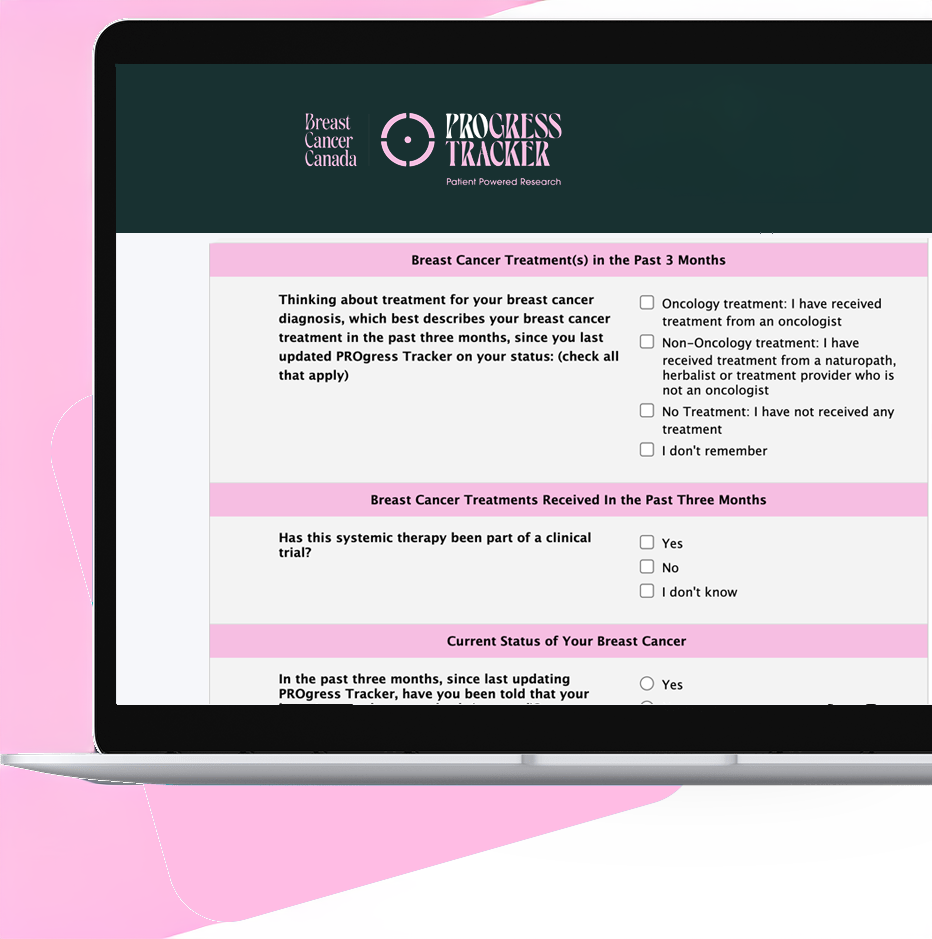 We invite you to learn more by reading the additional information provided here or contacting a Breast Cancer Canada volunteer to answer your questions at tracker@breastcancerprogress.ca